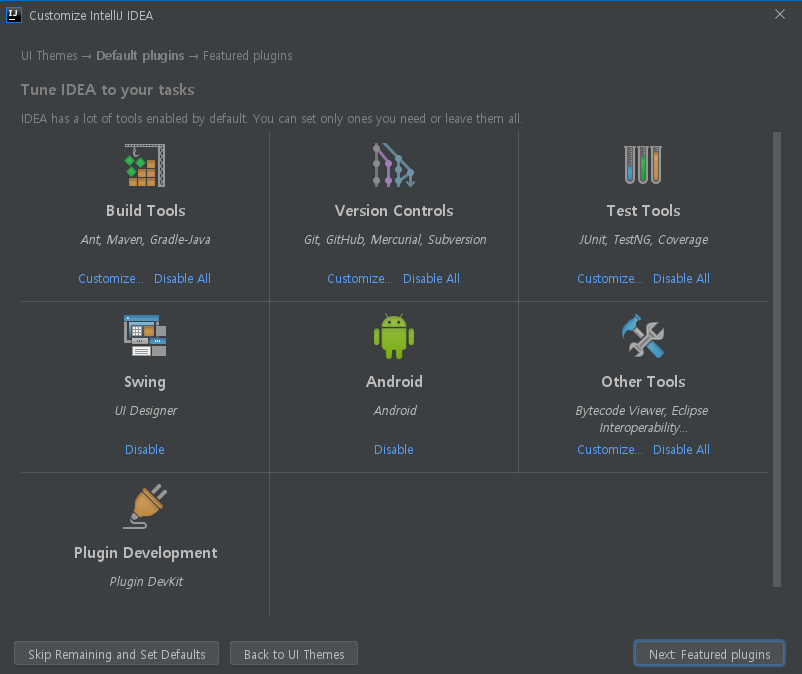 Install 클릭설치 완료 후 Finish 클릭실행 시 관련 내용 확인 후 Continue 클릭2가지 테마 중 한가지 테마를 선택한다. 'Next Default plugins' 클릭'Next: Featured plugins' 기본 세팅.이로써 인텔리J 시작 가능.