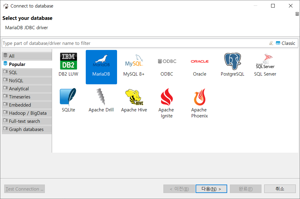 - 나와같은 경우는 Maria DB를 선택 하였다.