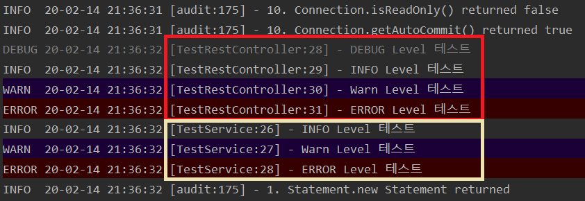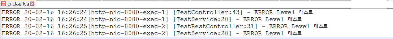 => INFO 20-02-16 16:34:42[http-nio-8080-exec-3] [TestController:41] - INFO Level 테스트