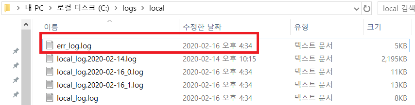 - local_log.2020-02-14.log 파일은 포스팅 2일 전에 찍어 두었던 로그이다. 일자별로 로그 설정이 되고 있음을 확인할 수 있다.