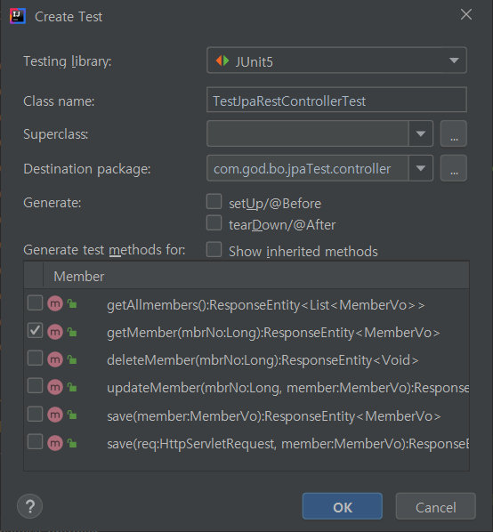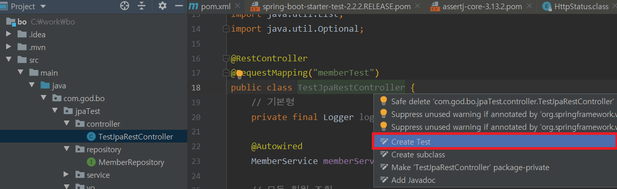 스프링 이니셜라이져로 프로젝트를 생성한 경우 이미 "spring-boot-starter-test"가 디펜던시 추가되어 있을 것이다.