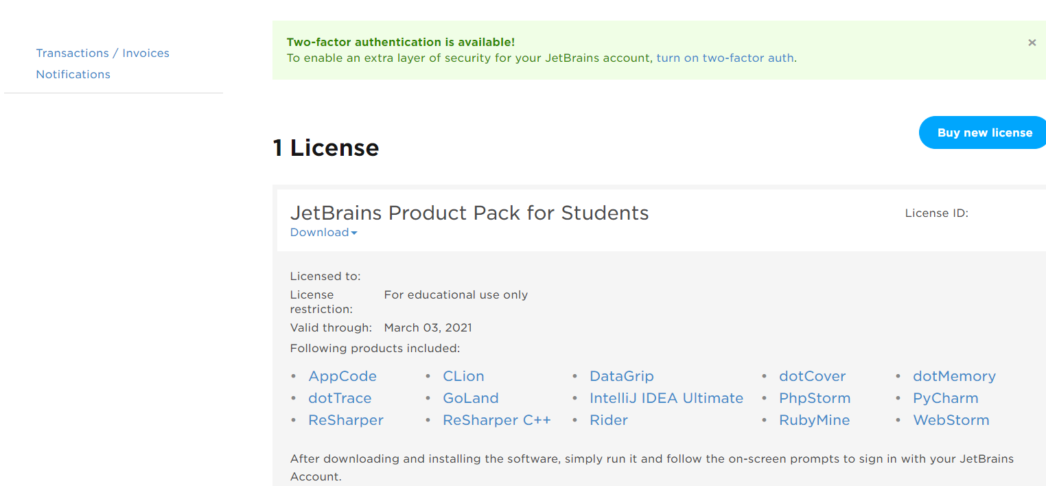 이로써 인텔리제이 학생 인증이 완료 되었다.