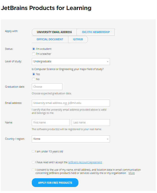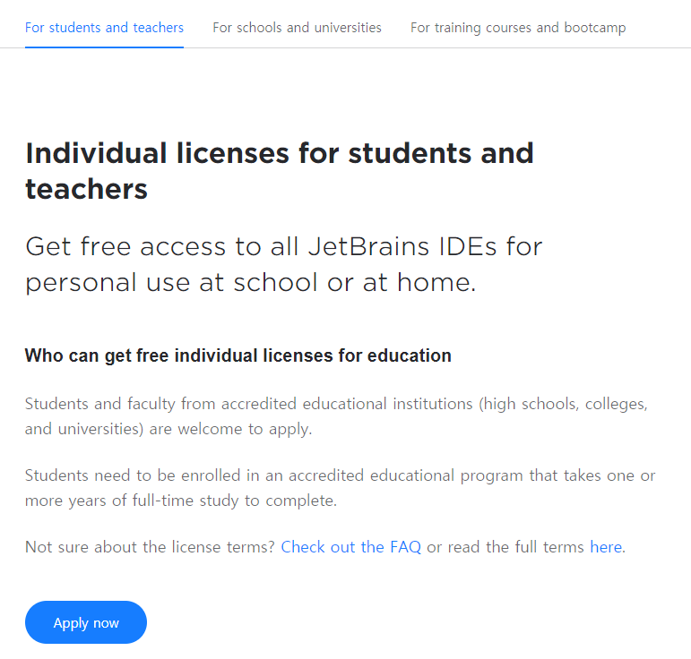 ※ Jet Brains의 학생 인증 관련 계속 바뀌고 있고, 앞으로도 UI는 바뀔 수 있으니 다음 url로 직접 접속 하여 인증 하기 클릭 하도록 하자.