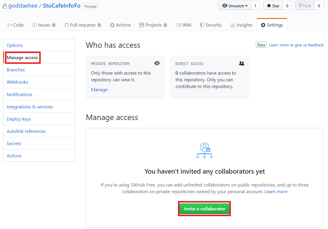 - "Settings"탭 클릭 > Manage access > "invite a collaborator" 클릭