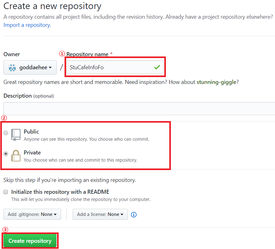 1) Repository name : 앞으로 사용하게될 저장소 이름, 결국 프로젝트 명이 된다. (깃헙 주소 뒤 프로젝트 명이 따라오는 것을 볼 수 있다.)