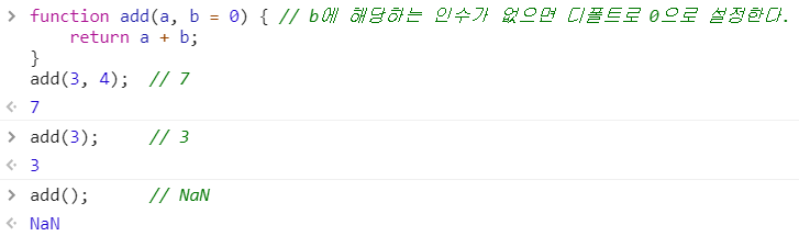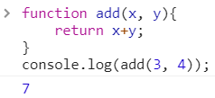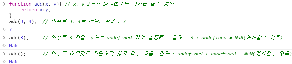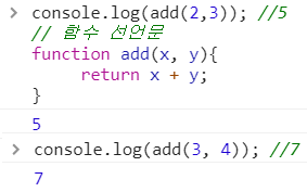 var result = add(3, 4); // add()함수를 호출하며 파라미터를 x,y에 대입한다. 결과7을 result에 대입니다.