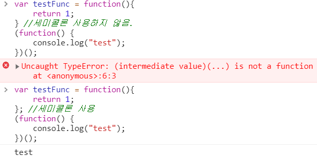 - 에러가 발생한다. 자바스크립트 파서가 testFunc()의 함수 정의에서 세미콜론을 사용하지 않아, return 1; } 이후 함수가 끝났다고 판단하지 않기 떄문이다.