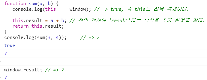 this.result = a + b; // 전역 객체에 'result'라는 속성을 추가 한것과 같다.