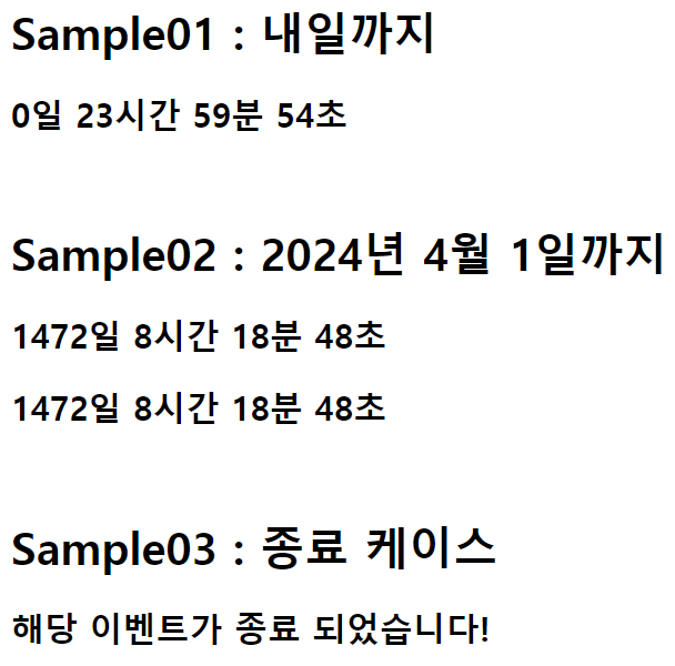 countDownTimer('sample02', '04/01/2024 00:00 AM'); // 2024년 4월 1일까지, 시간을 표시하려면 01:00 AM과 같은 형식을 사용한다.