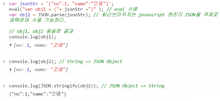 var obj2 = JSON.parse(jsonStr); // 최신브라우저는 javascript 엔진이 JSON을 객체로 채택하여 사용 가능하다.