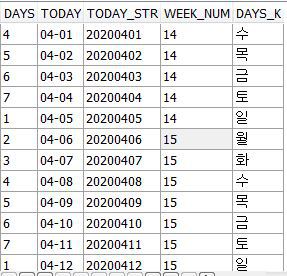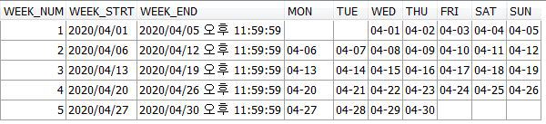 해당 쿼리를 실행하면 현재 기준인 2020년 4월 달력의 모습을 가져왔다.