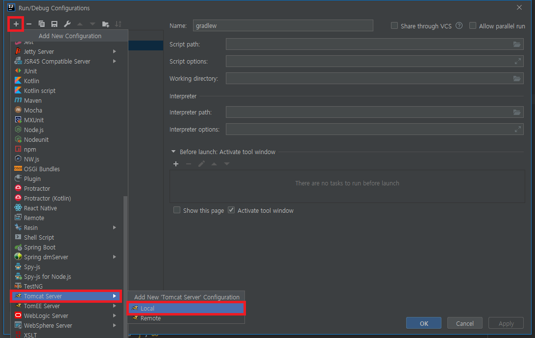 2) + 클릭 >> Tomcat Server >> Local 클릭