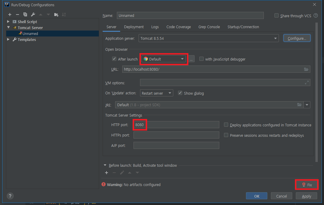 - Warning: No artifacts configured : Deployment 탭에서 나머지 설정을 해주거나, Fix 버튼을 클릭하여 마무리 설정을 해주면 된다.