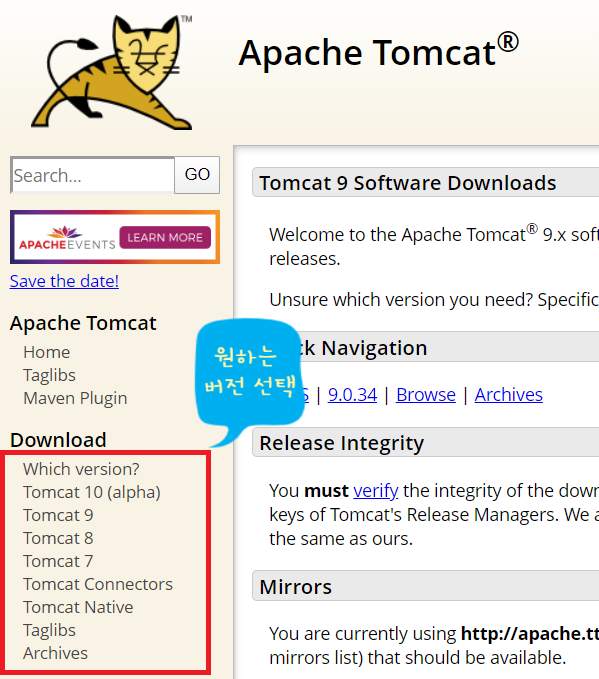 (나와 같은 경우는 Tomcat 9를 선택 하였다. Tomcat9는 Java 8부터 지원하니 참고 하자.)