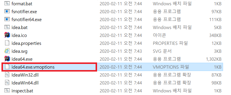 (ex, 나와 같은 경우는 64bit용 파일을 실행하므로 [ idea64.exe.vmoptions ] 파일을 열어 본다.)