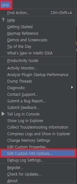 - Help >> Edit Custom VM Options... 클릭