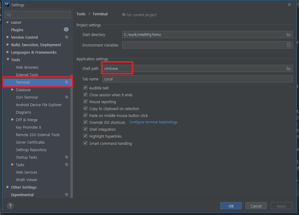 인텔리 제이에서 기본 CMD 터미널을 사용해보았을 것이다.