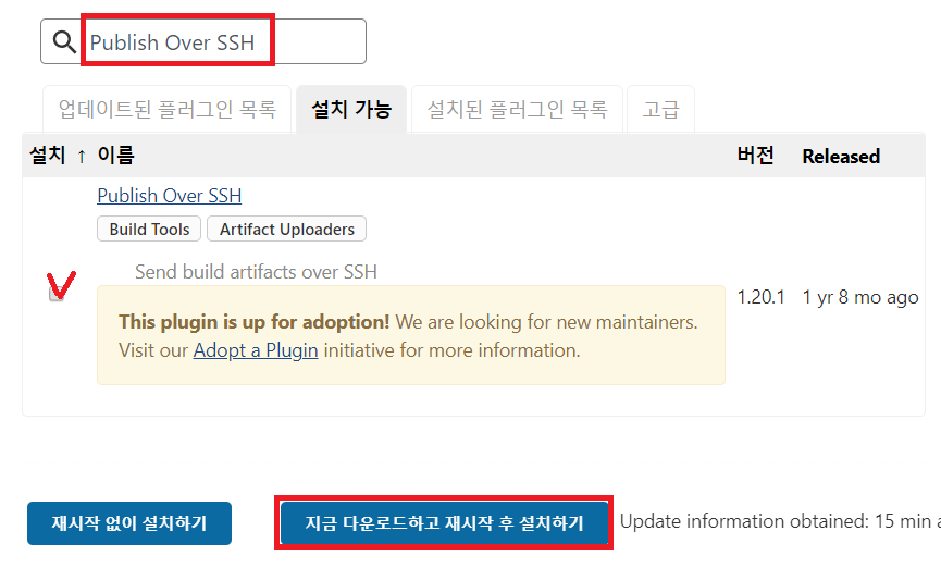 - Publish Over SSH 검색, 체크 하여 다운로드 및 재시작