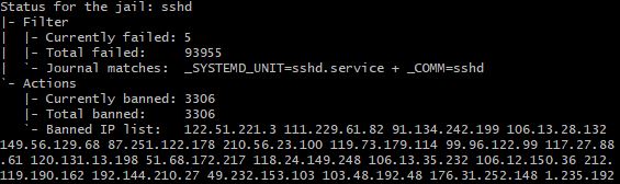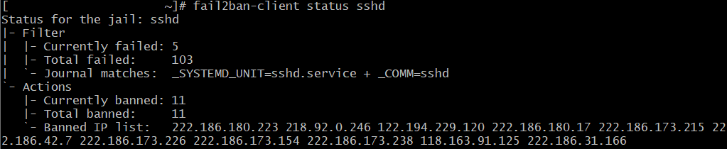 - 전체 차단 정보는 fail2ban 의 클라이언트 유틸리티인 fail2ban-client 명령어를 통해서 확인해 볼 수 있다.