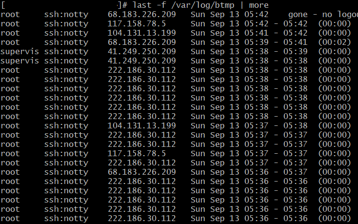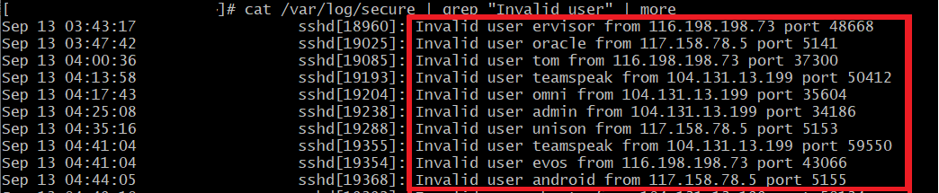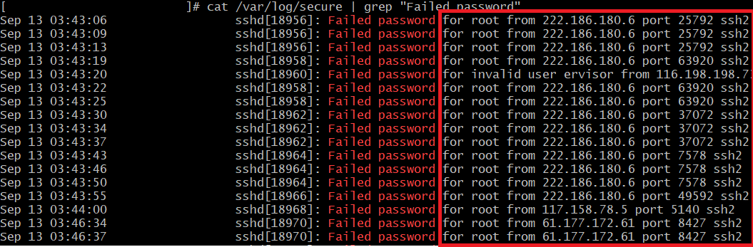 - Linux 서버를 공개망에서 사용하면서 방화벽을 사용하지 않는 경우 ssh 로그인을 지속적으로 시도하는 ip, 로그를 볼 수 있는데, 이는 무차별 대입 공격을 받고 있일 확률이 크다.