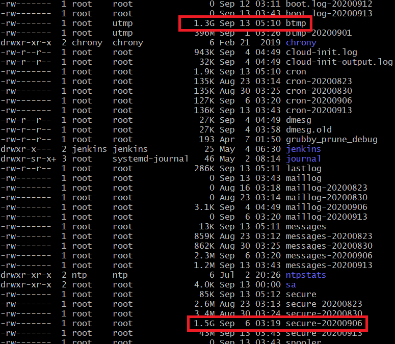 - 엄청난 접속 시도로 로그파일 용량이 몇기가나 쌓인것도 볼 수 있다.