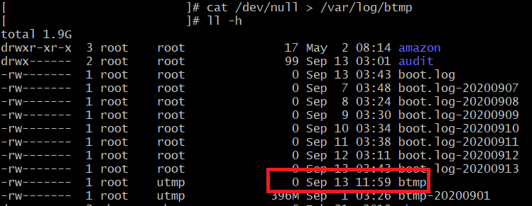 ※ 혹시 로그인 실패 로그 용량이 너무 커진 경우 다음 명령어를 실행하여 용량을 비워주도록 하자.