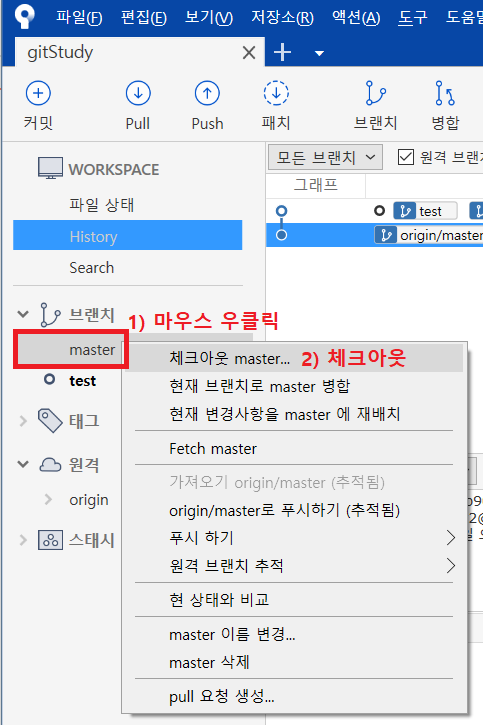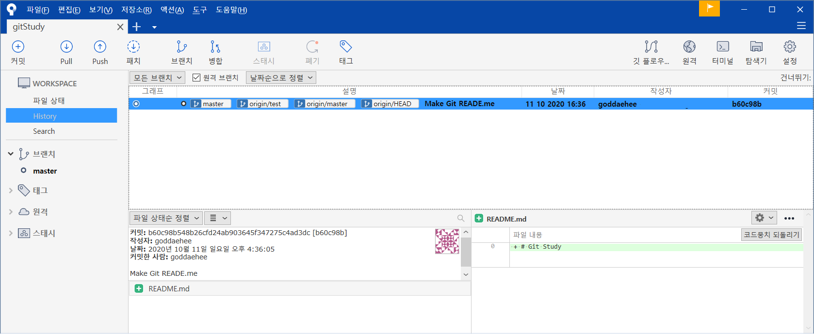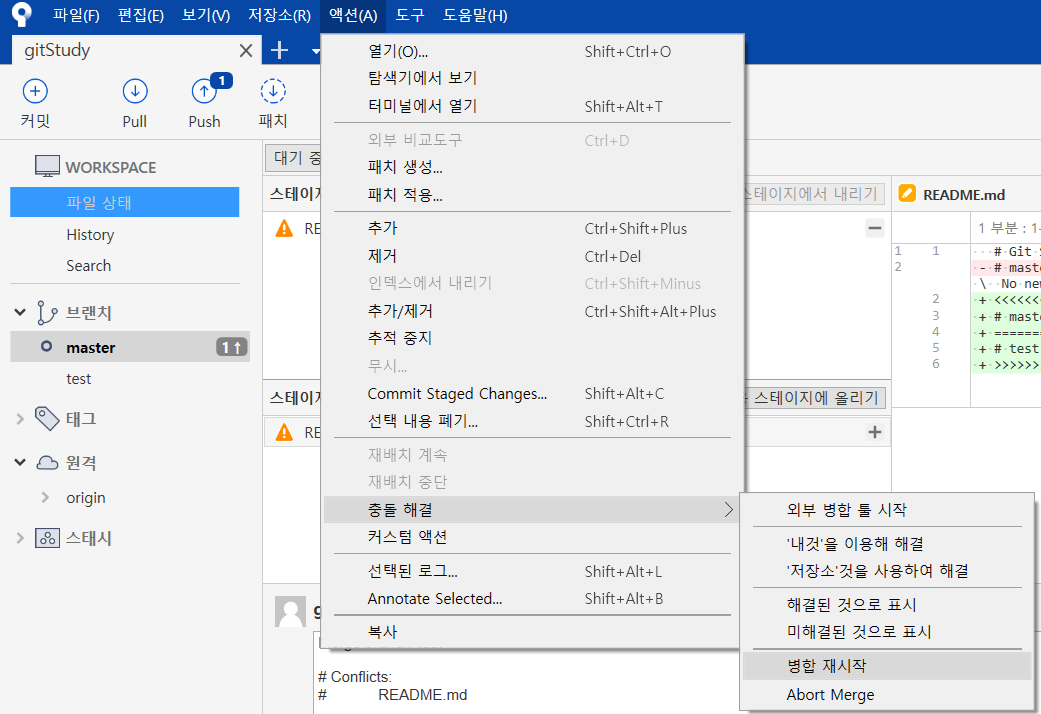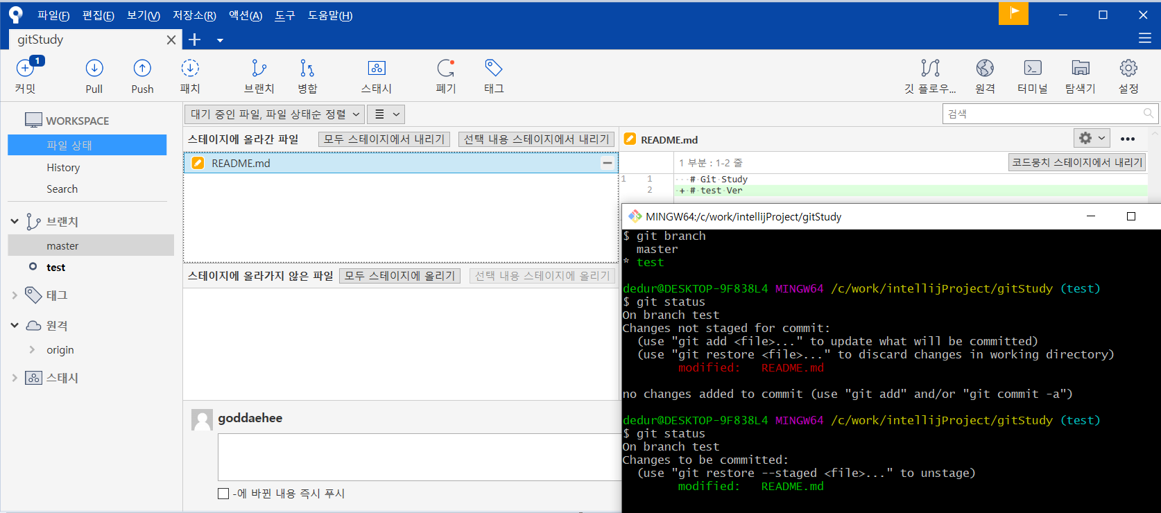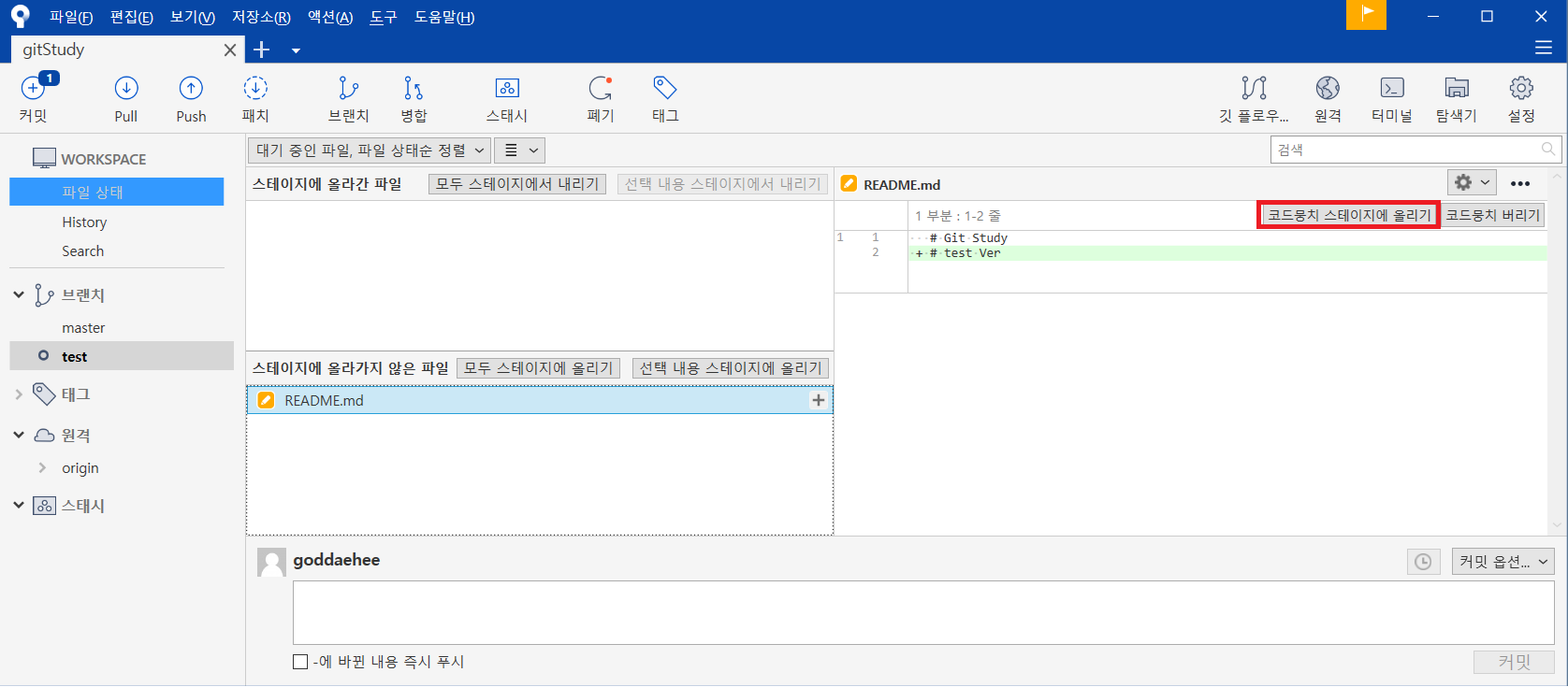 - 여기서 부터는 기존 CLI 명령어로 했던 내용을 소스트리로 간단히 작업 해보려하니 패스해도 좋을 것 같다.