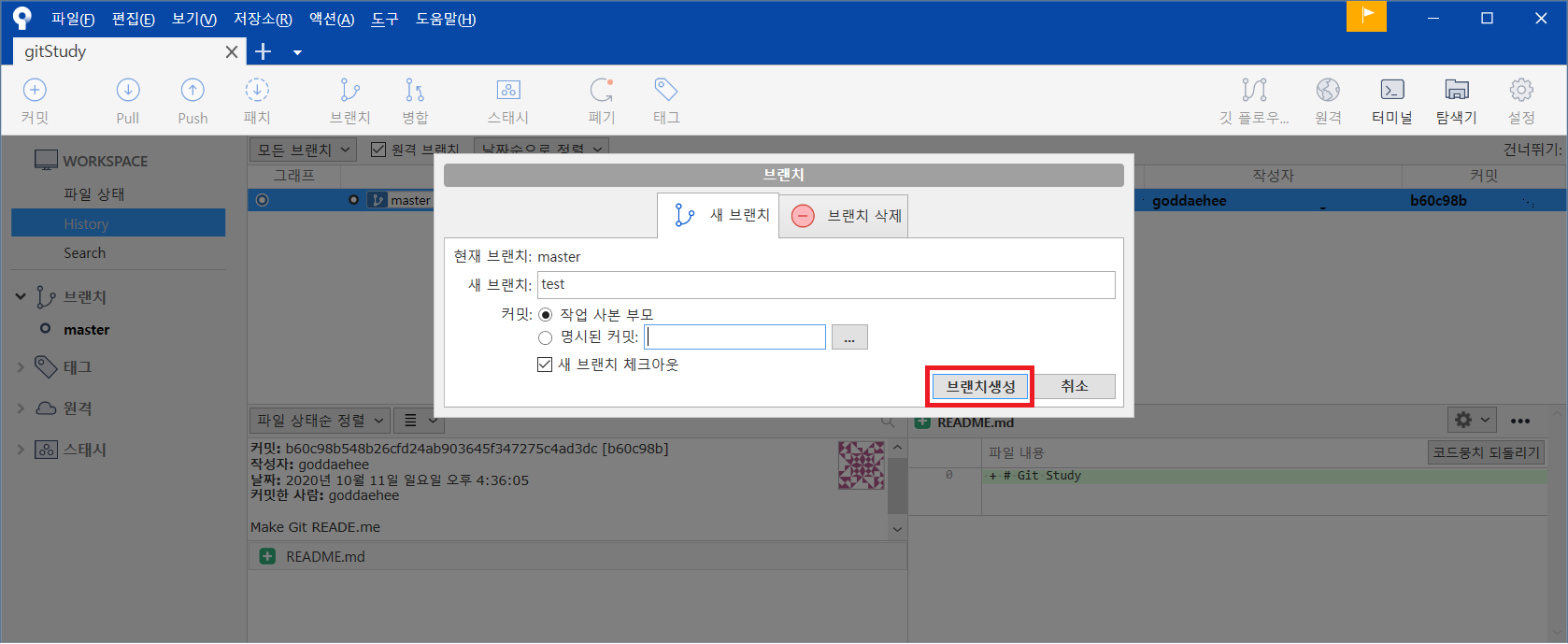 - "브랜치" 클릭 > 브랜치명 입력 > "브랜치 생성" 클릭