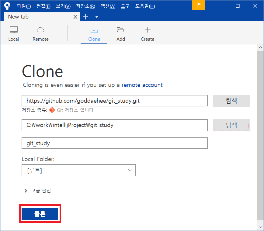 - 복사한 원격 Repository의 주소 입력, 저장할 폴더 경로 선택, 프로젝트명 입력 후 "클론" 클릭