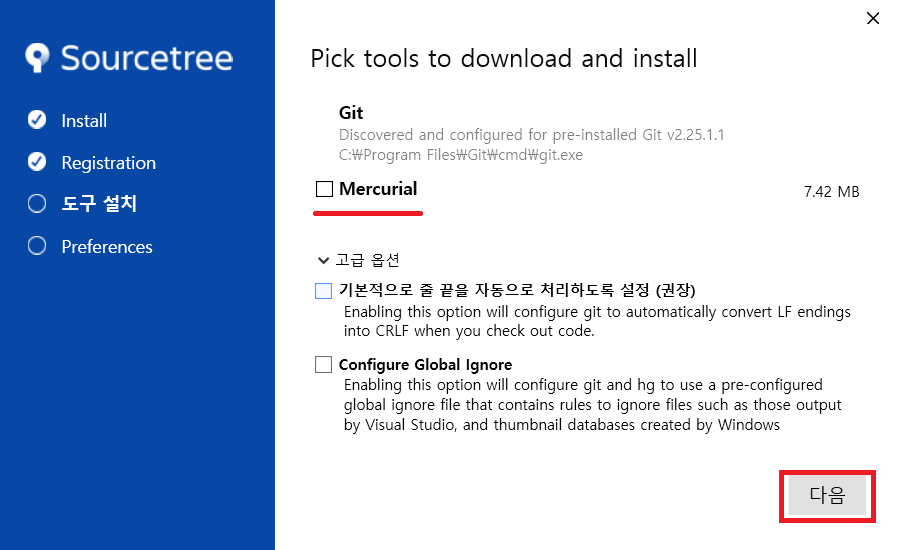 - Mercurial(분산 버전 관리 시스템중 하나)은 체크 해제 후 "다음" 클릭