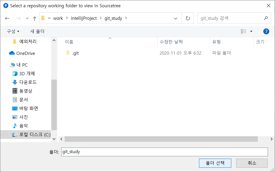 - 본인의 로컬 레파지토리 선택후 "폴더 선택" 클릭