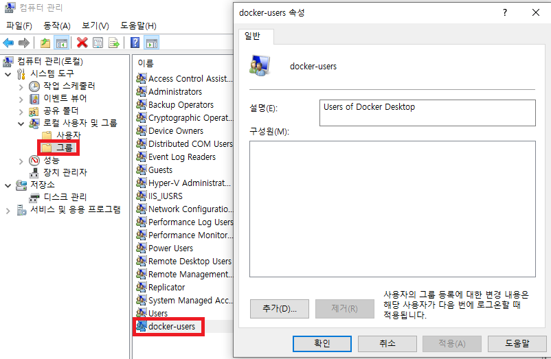 - 컴퓨터 관리(로컬) => 로컬 사용자 및 그룹 => 그룹 => "docker-users" 클릭