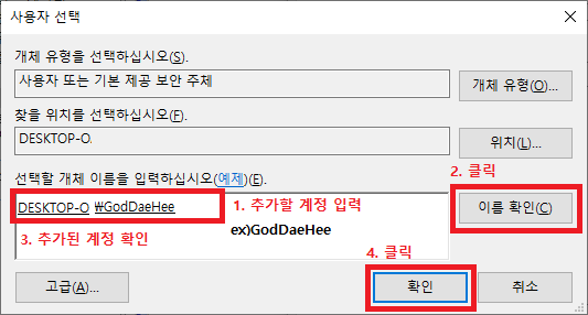 - 본인이 추가할 계정 작성, 이름 확인 후 확인 클릭