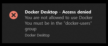 - 얼추 내용을 추측해보면 내가 "docker-users"그룹에 속해 있어야 한다는 것을 보니 사용자 계정 권한 문제인 것 같다. 이럴때 어떻게 해결할 수 있는지 간단히 적어두려 한다.