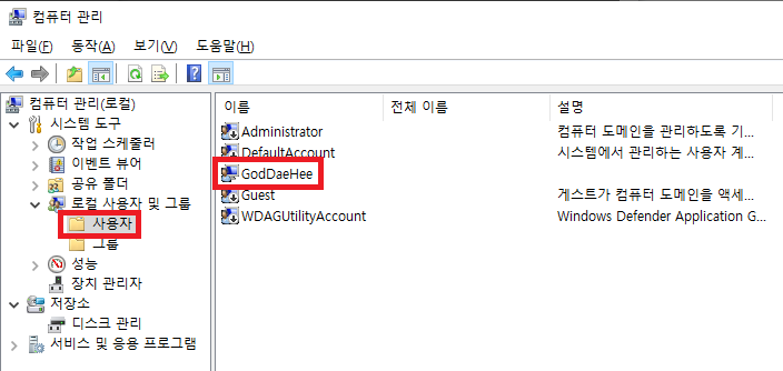 - 컴퓨터 관리(로컬) => 로컬 사용자 및 그룹 => 사용자 => 그룹 설정할 계정 확인