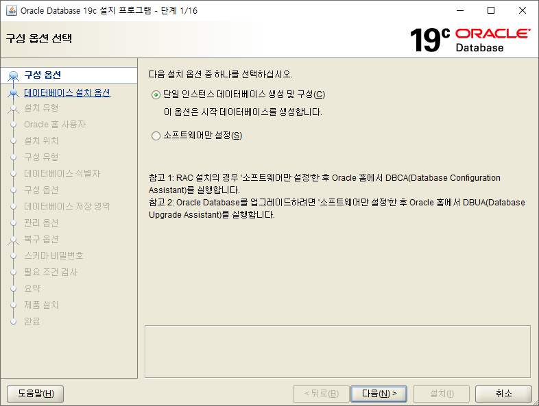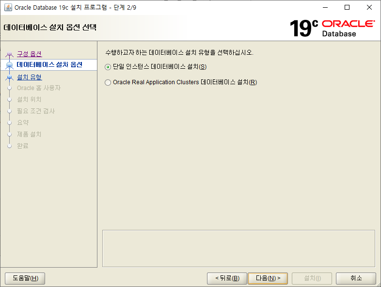 - 개인 공부용이기 때문에 오라클 Rac구성을 고려하지 않을 것이다. 단일 인스턴스로 구성하기 클릭.