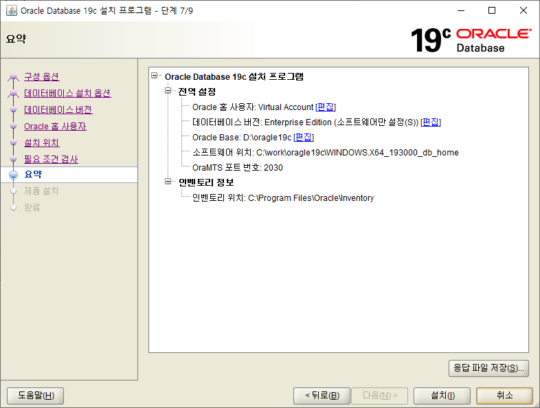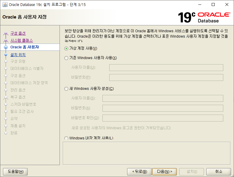- 오라클에서는 '가상 계정 사용' 또는 "표준 Windows 사용자 계정 지정"을 권장 한다고 한다.