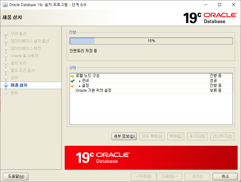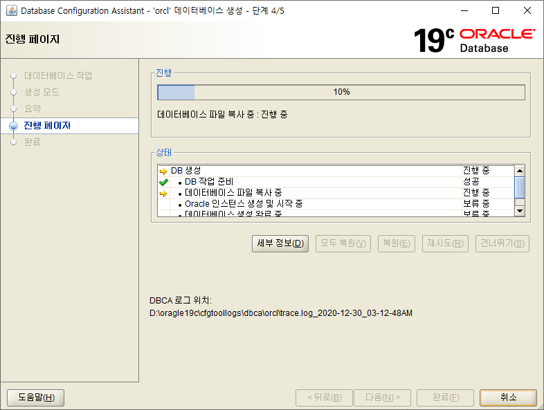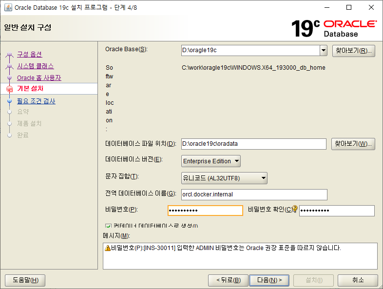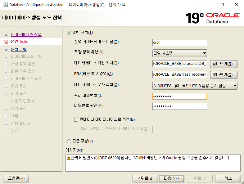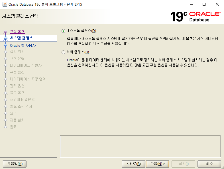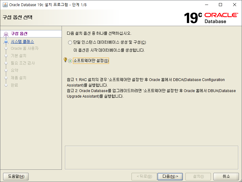- 해당 오류가 발생하는 경우엔 "시스템 클래스" 설정으로 돌아가 소프트웨어만 설정(S)한 후 이후에 DBCA를 실행하여 다시 구성하면 고민 없이 해결 할 수도 있다.