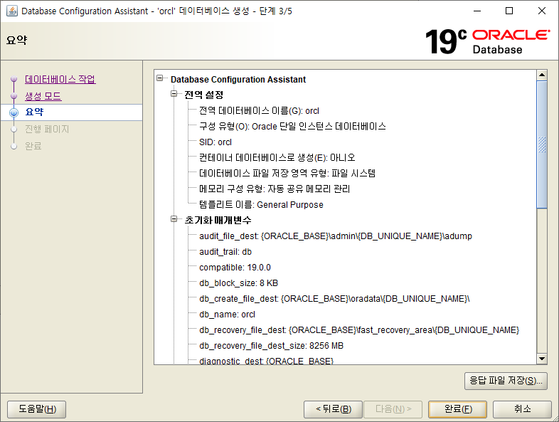 4) FRA(빠른 복구 영역)(A) : flashback 로그, 아카이브 로그 등 나중에 사용하다보면 매우 유용하지만, 운영 환경에서 잘못하면 용량을 엄청 잡아먹는 파일 등의 경로. 기본설정으로 설치.