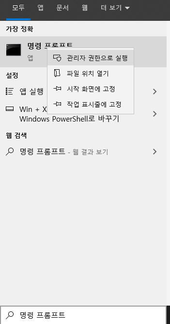 - Window키 >> "명령 프롬프트" 검색 >> 마우스 우클릭 >> 관리자 권한으로 실행