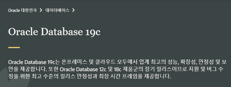 ※ 위에서 보다시피 19c는 장기 릴리스, LTS Release 라고 한다. Java도 마찬가지지만 이왕 공부하려면 Long Term Support Release 에 해당하는 버전을 공부하는게 좋을 것 같다.