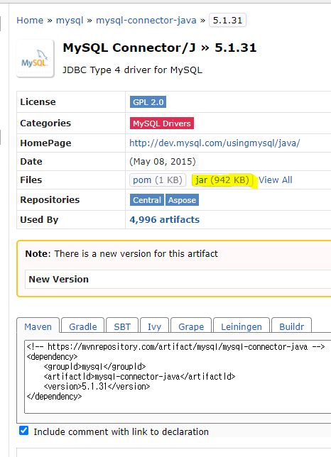 ex) mvnrepository.com/artifact/mysql/mysql-connector-java/5.1.31