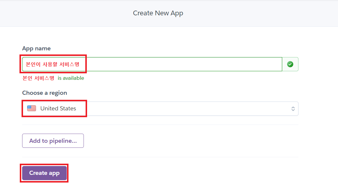 1) App name : 본인이 서비스할 서비스 명 (헤로쿠 내에서 고유한 프로젝트명만 사용 가능하다.)