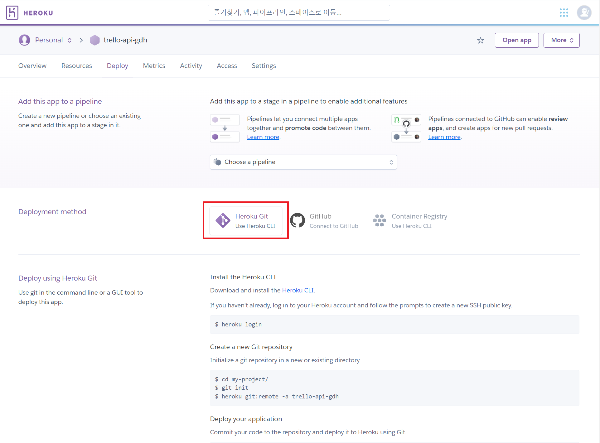heroku git:remote -a 본인의앱이름