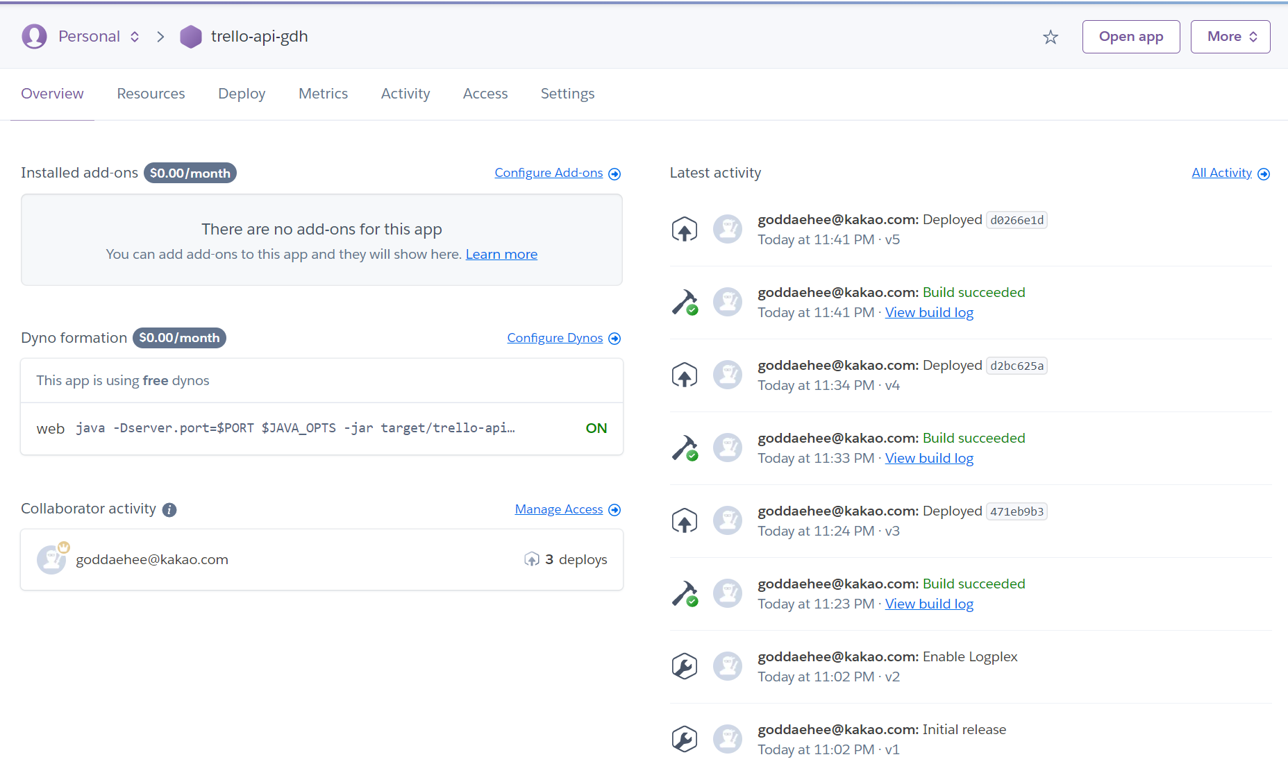 ※ 헤로쿠는 30분간 아무 트래픽이 없으면 앱을 Sleep 처리 해버린다. 이후 다시 서비스를 호출 할 때 웨이크업 타임이 필요 하다.