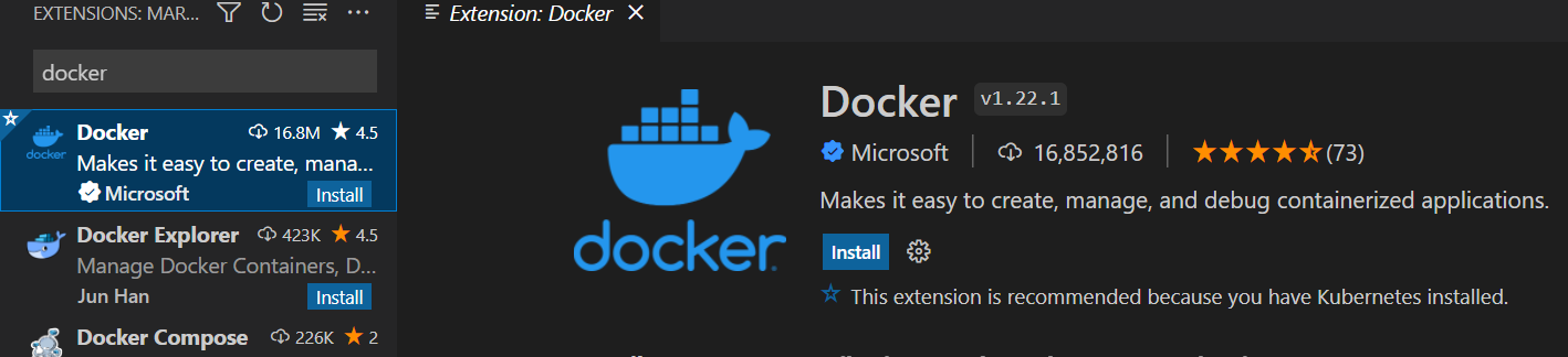 - Visual Studio Code에 확장도구로 Docker를 설치해 준다.