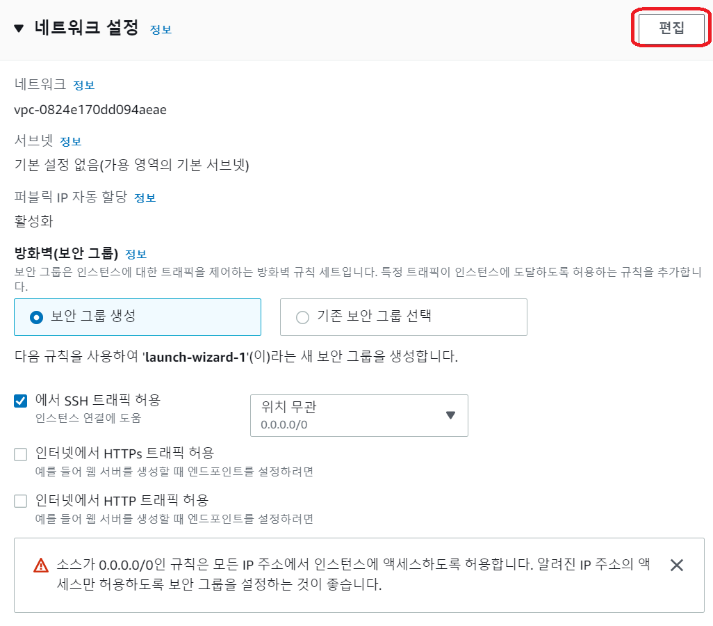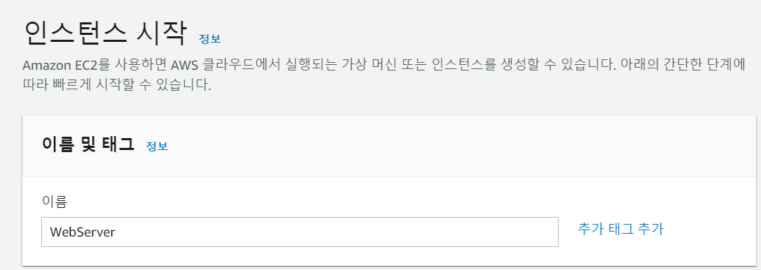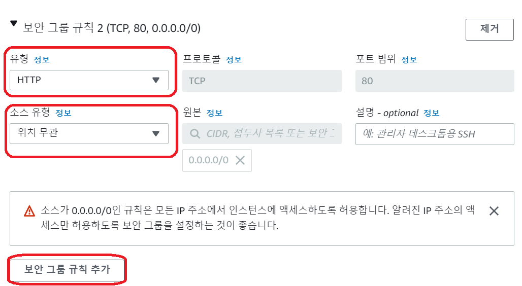 - 보안 그룹 이름 입력 (나와 같은 경우 MyWebServerGroup 이라는 기본 제시 그룹명 입력)