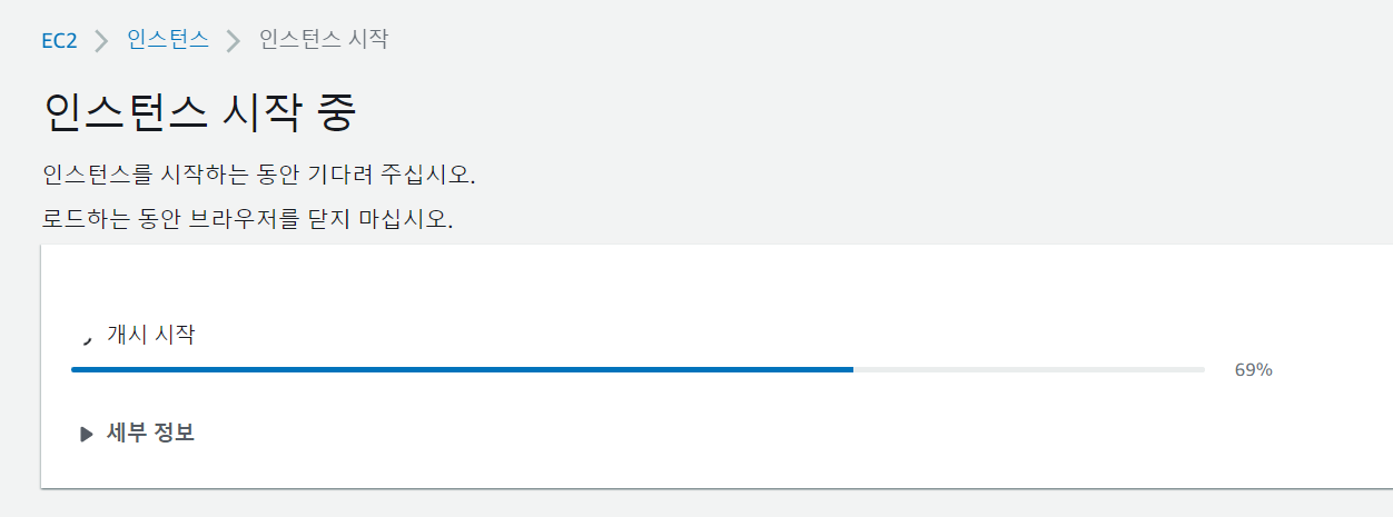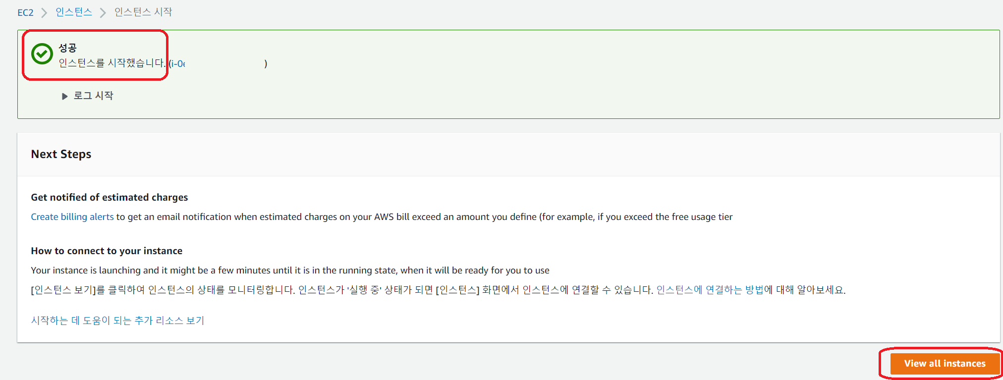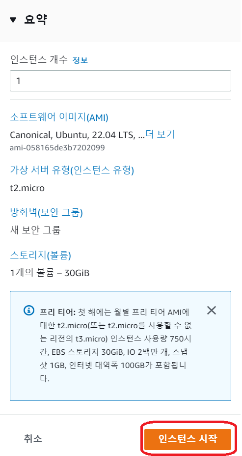 - 혹시 이상이 없는지 확인 한 후 "인스턴스 시작" 버튼을 클릭.