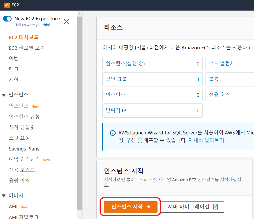- 중간에 보이는 "인스턴스 시작" 버튼을 클릭한다.