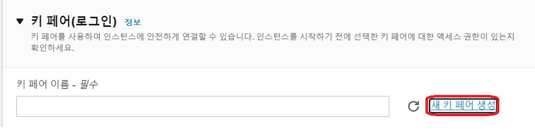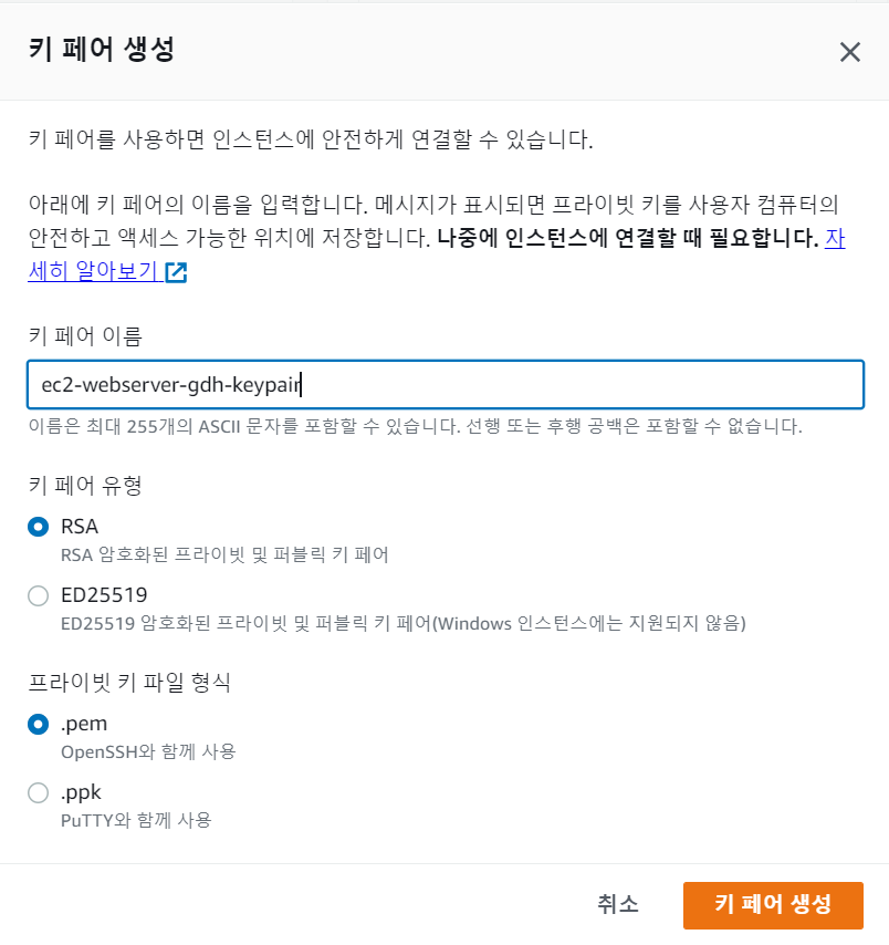 - 본인이 지정할 keypair 이름을 작성한다. 나와 같은 경우 익숙하기도 하고, SSH 를 사용할 것이기 때문에 pem 방식을 선택 하였다. "키 페어 생성" 클릭시 키페어가 생성되며 다운로드 된다.